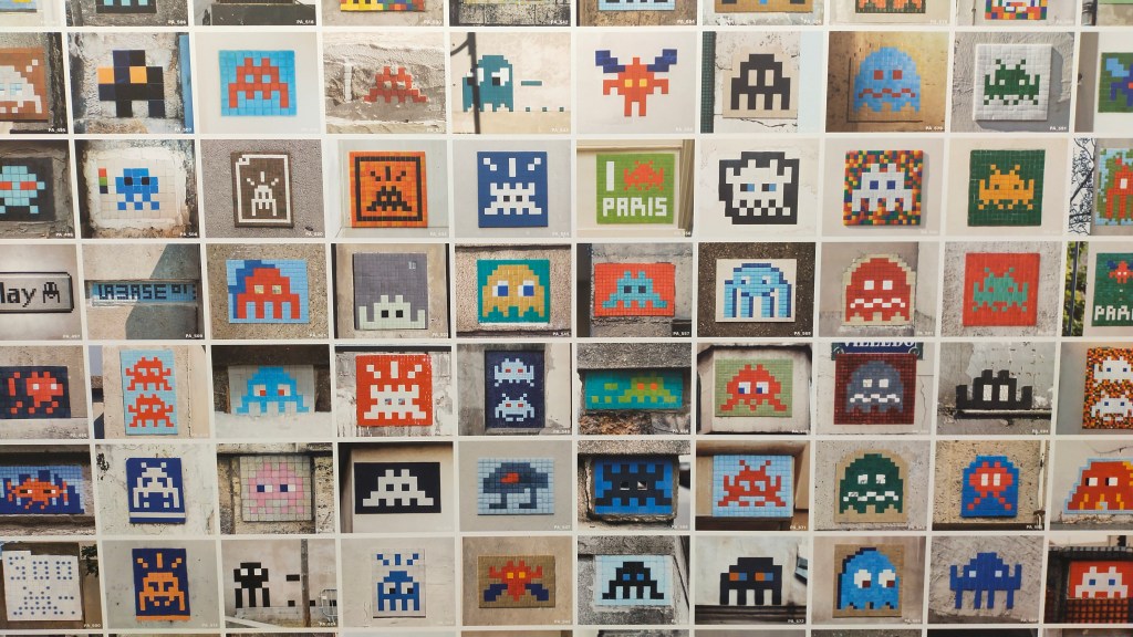 Retour dans le 3e arrondissement. Sur 5 étages et plus de 3 500 mètres carrés, l’artiste présente l’ensemble de son travail dans ce qu’il nomme son « Invader Space Station » ; son ISS à lui. Les visiteurs découvrent des mosaïques bien sûr, de sa première posée dans la rue, près de Bastille, en 1998 à la 1 500e apparue récemment sur les tuyaux du centre Pompidou. Mais aussi des vidéos de ses installations, des photos de ses invasions à travers le monde (San Diego, Tokyo, Londres, etc.) et des tableaux réalisés à l’aide de Rubik’s Cubes (assez bluffant !). L’artiste s’amuse à parler d’un nouveau genre : le rubikubisme. D’autres projets comme sa collection personnelle de figurines Kinder (elle plaira aux enfants) est aussi exposée mais présente beaucoup moins d’intérêt.